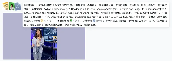 Our experimental setup in Seedance 2.0. We pushed the model’s multimodal capabilities by feeding it a detailed prompt, complete with reference images for the speaker and background, an audio track specifically for voice cloning, and strict textual instructions for the generated screen. We replicated this exact setup for Kling and Veo as well.